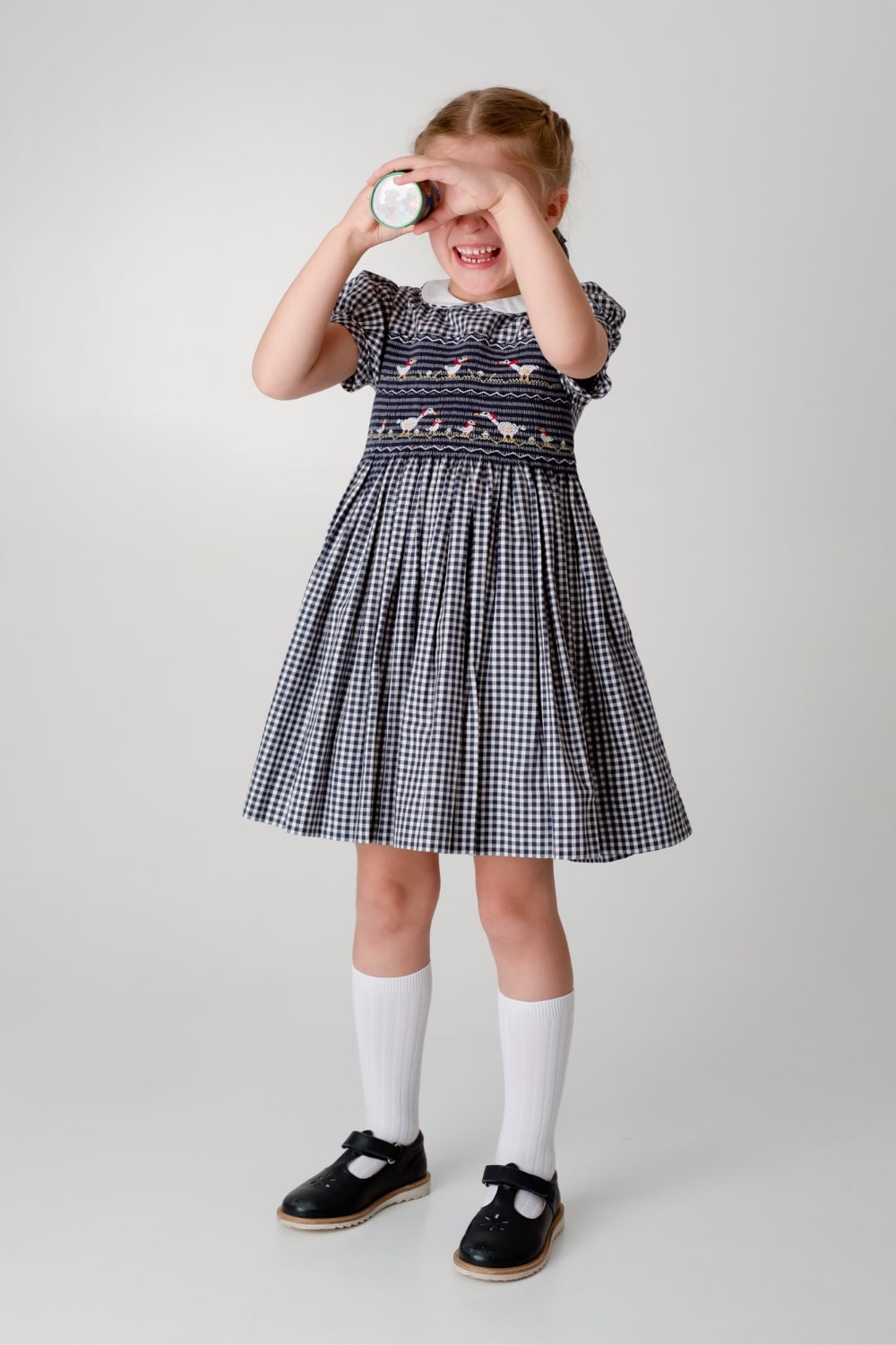 Geese: endlessly appearing in children’s stories across every culture since the time dot, associated with joy, imagination and freedom… and now waddling right across the Berenice dress. The family of geese are hand embroidered on the chest, edged with traditional white zig-zag smocking.