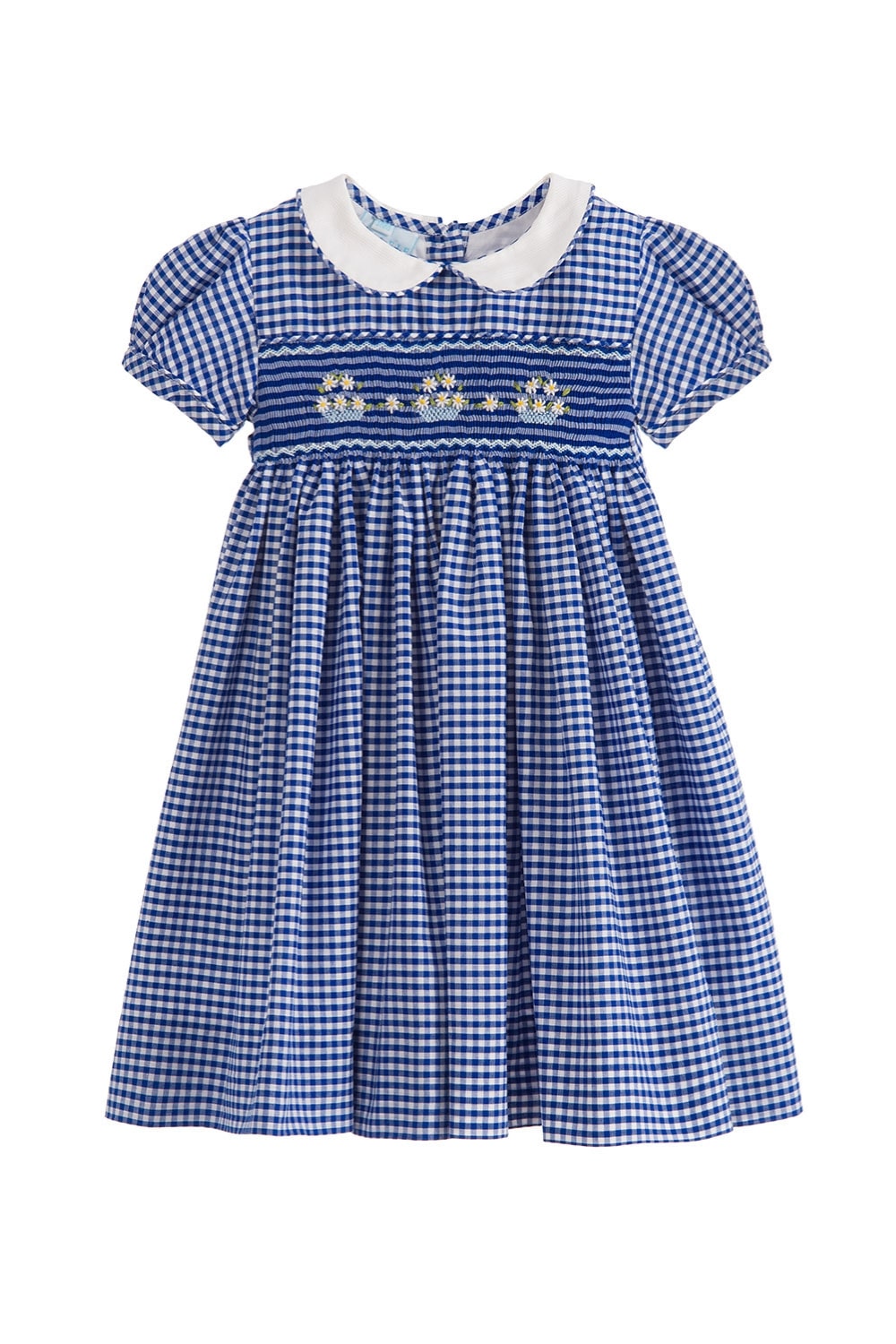 The Desiree dress has hand embroidered daisies on a sunny blue gingham. Delicate puffed sleeves and a peter pan collar in white gives the dress a signature Annafie silhouette.