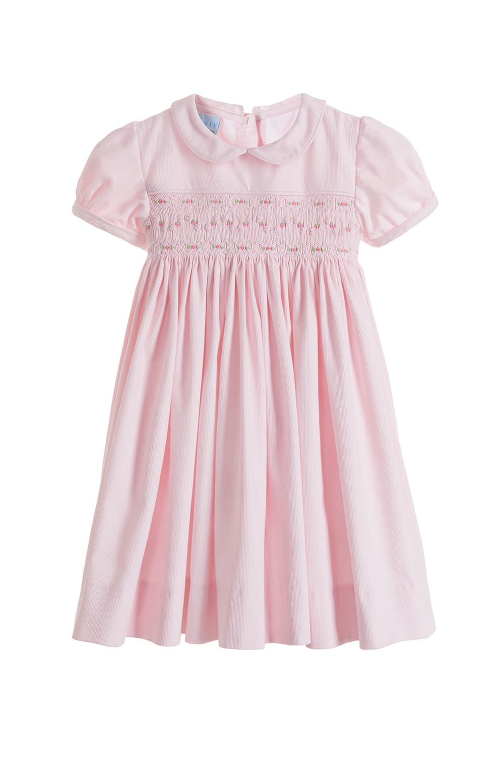 This charming hand-smocked and embroidered pink dress is a perfect blend of elegance and comfort. Crafted from 100% sturdy cotton, it is fully lined to ensure a soft and smooth feel against the skin. The dress features delicate capped sleeves and a sweet peter pan collar, adding a vintage-inspired touch. The intricate embroidery showcases soft pink and white roses, bringing a whimsical and feminine feel to the design.