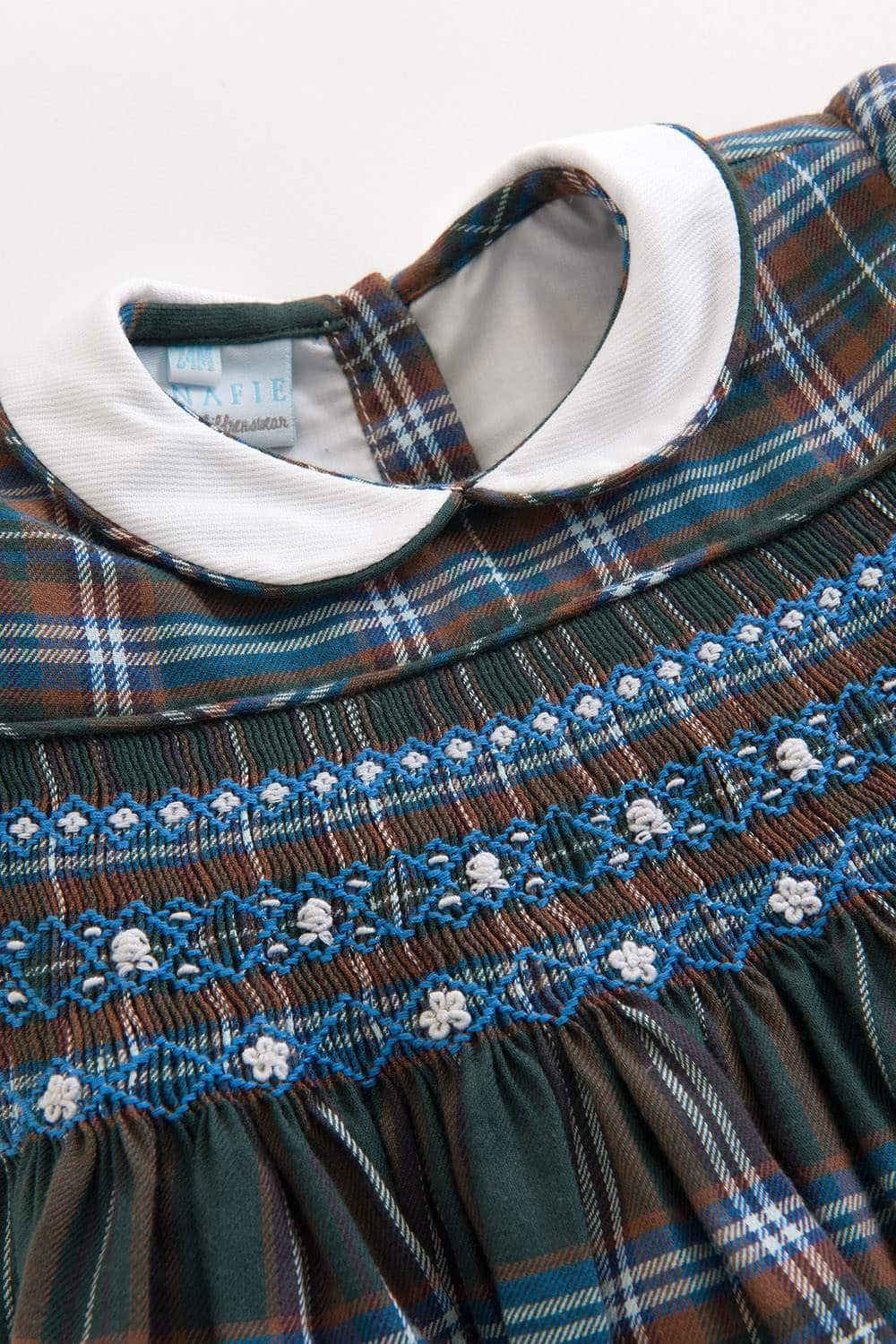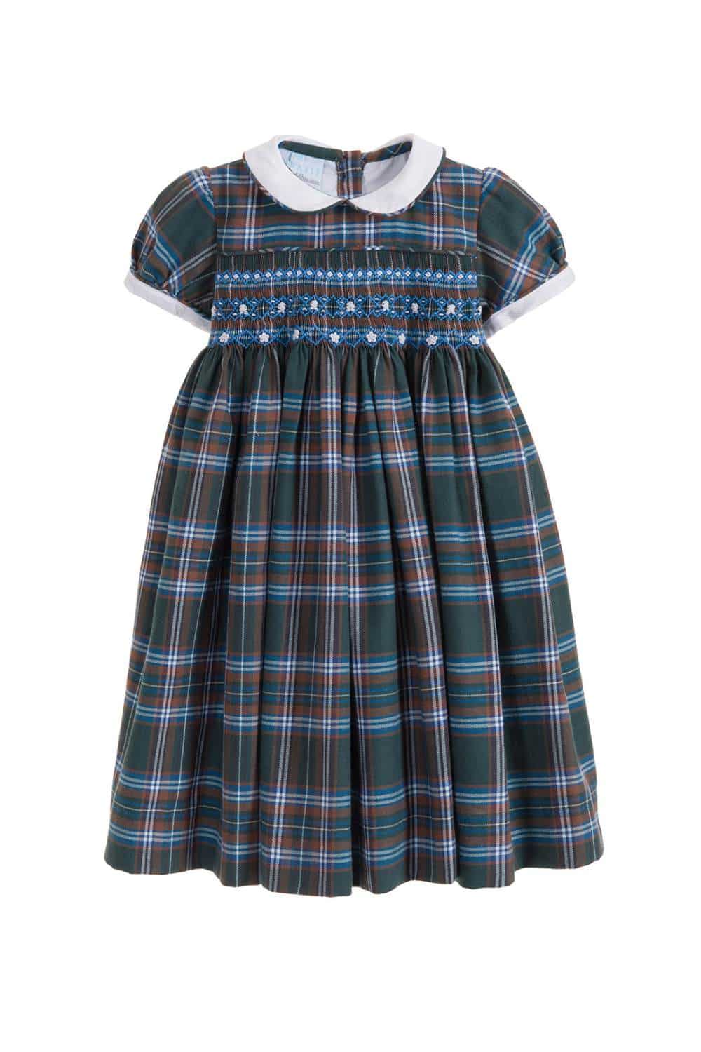 Made in a rich tartan of fir green, blue and brown, it features beautiful hand smocking across the chest, adorned with delicate embroidered flowers. A crisp white Peter Pan collar and short sleeves give it a timeless finish that feels both polished and fun.