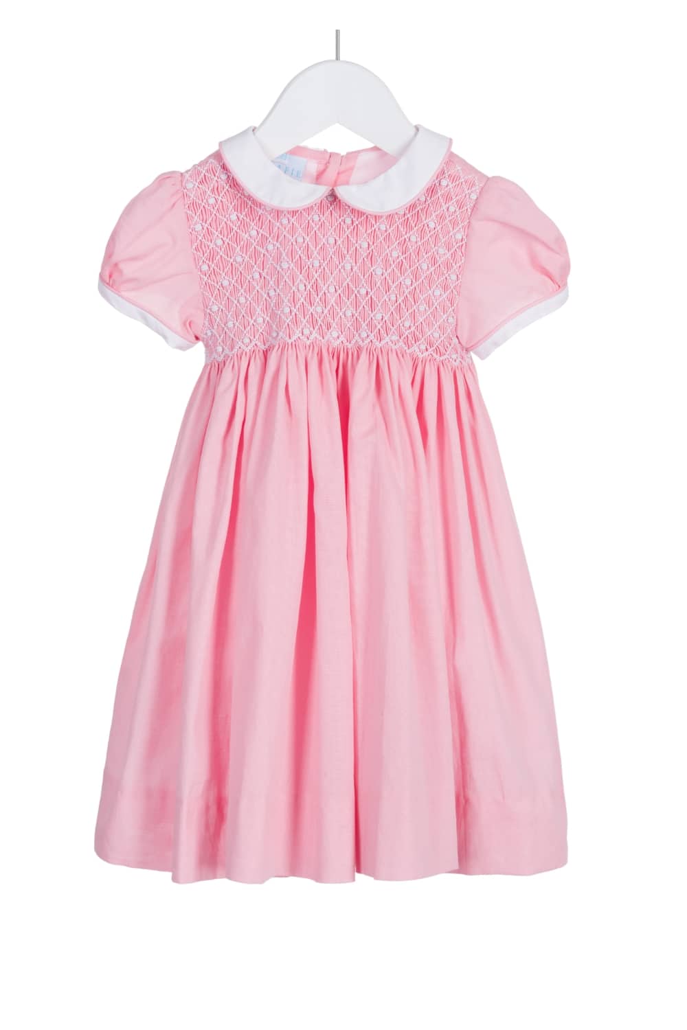 Across the front, delicate hand smocking and embroidery showcase the artistry behind every stitch. The white peter pan collar, finished with fine pink piping, completes the look with a polished, timeless touch.